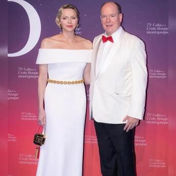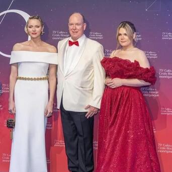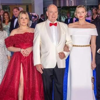 夏琳王妃参加摩纳哥慈善晚宴,她穿着修身长裙配黑金刺绣手包,港风卷发加红唇矜贵又美丽。